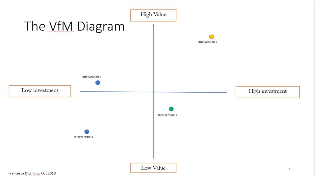 The findings are summarised in a VfM diagram where the different programme areas are distributed across four quadrants separated by two axes illustrating the value and the investment. This helps to visually represent the areas that are not VfM (bottom two quadrants) and those that are VfM (top two quadrants). The purpose of the exercise is to identify potential changes in the strategic approaches and/or the allocation of the resources that would enable all the programme areas to be placed in the top two quadrants and therefore be VfM.